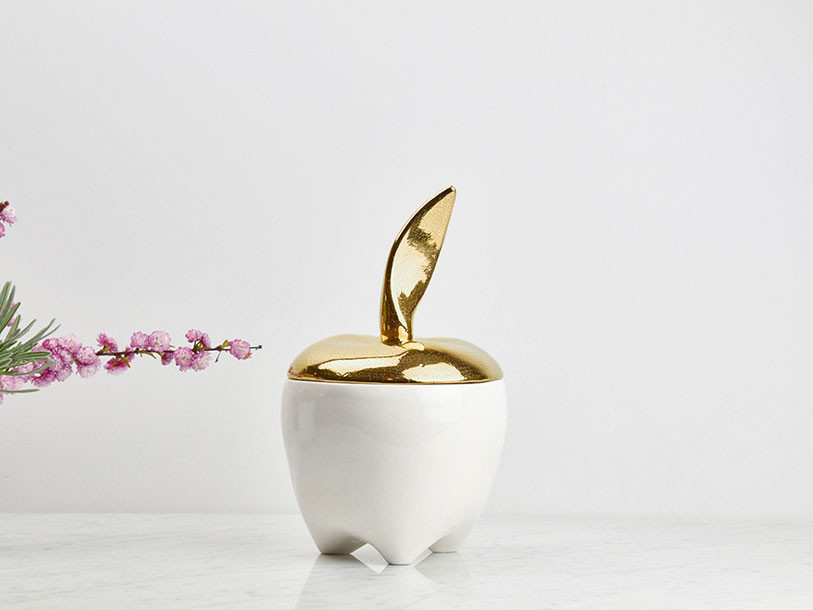 Posoda s pokrovom (ø = 15 cm, v = 24 cm, porcelan, pozlata (18 karatno zlato), bela glazura)Jabolko je simbol nesmrtnosti, simbol raja ter simbol duše in njene neskončnosti.